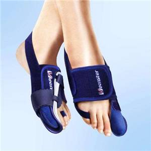 5)踇外翻矫形器具的应用,通过日、夜用踇外翻矫形器,给踇趾一个持续的向内侧牵拉的力量,以达到缓解踇外翻的作用。