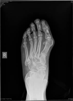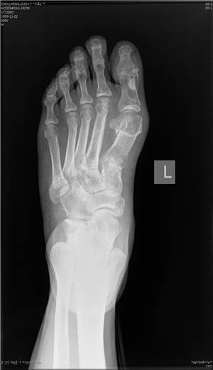 骨赘不断增大,和外部鞋面的摩擦形成拇囊炎、局部红肿,表面皮肤形成胼胝体神经炎,引发疼痛和踇趾的感觉异常。第一跖骨头外侧在这种向外的挤压的应力下出现破骨重建,久之引起跖骨头关节面的外翻倾斜。